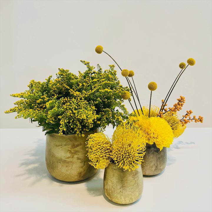 MARRAKECH Trio of vases in antique gold COLOR Gold DIMENSION Length: 9-12-16 cm Width/Depth: 9-12-16 cm Height: 12-12-19 cm PACKING Cardboard box Length: 20 cm Width/Depth: 20 cm Height: 18 cm RENTAL PRICE RENTAL PRICE FOR 1/2 DAYS 3/5 DAYS 6/7 DAYS 20,00 € 20,00 € 20,00 € Net price based on 1/2 days - 3/5 days - 6/7 days rental, excluding transport/delivery/pick-up, positioning, insurance, VAT RENTAL PRICE FOR TRADE FAIR All-inclusive price incl. rental, transport, delivery/ pick up directly at your booth/stand.